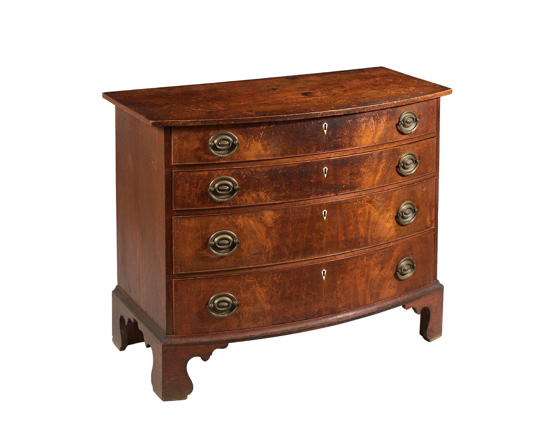 This refined Federal bow-front chest exemplifies the elegant proportions and restrained ornament associated with late eighteenth-century Massachusetts furniture. The serpentine form is complemented by delicate stringing and original hardware, all retained in an exceptional state of preservation.