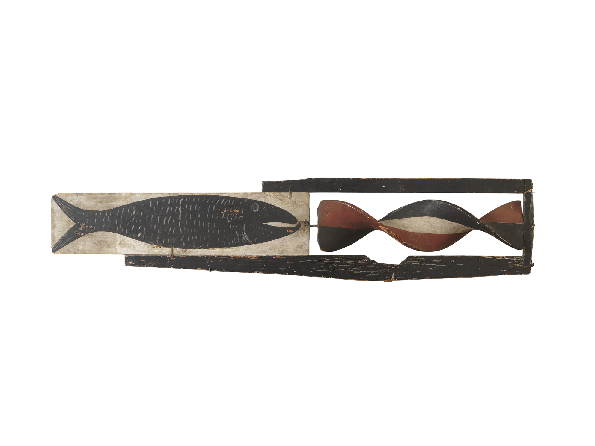 This unusual fish spinner weathervane demonstrates the ingenuity and charm of American folk craftsmanship. Carved from white pine and mounted with iron wire elements, the piece retains its original painted decoration and an untouched dry surface.